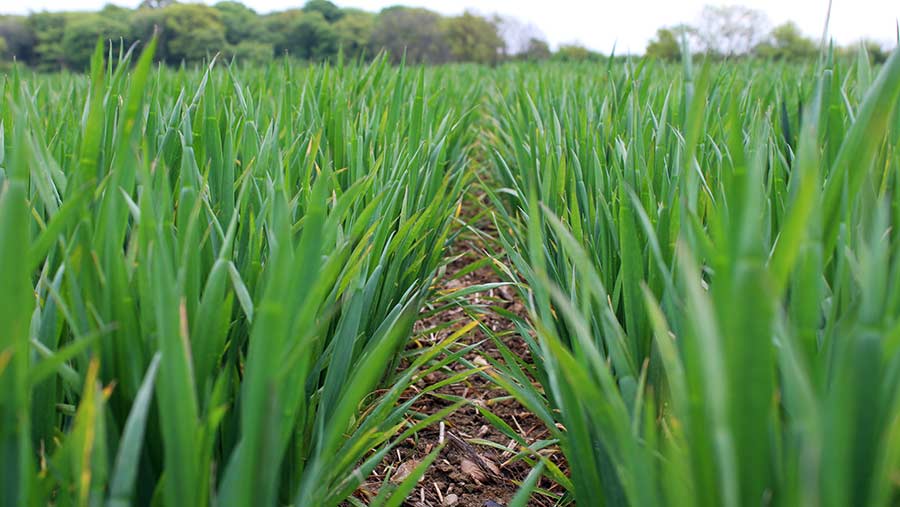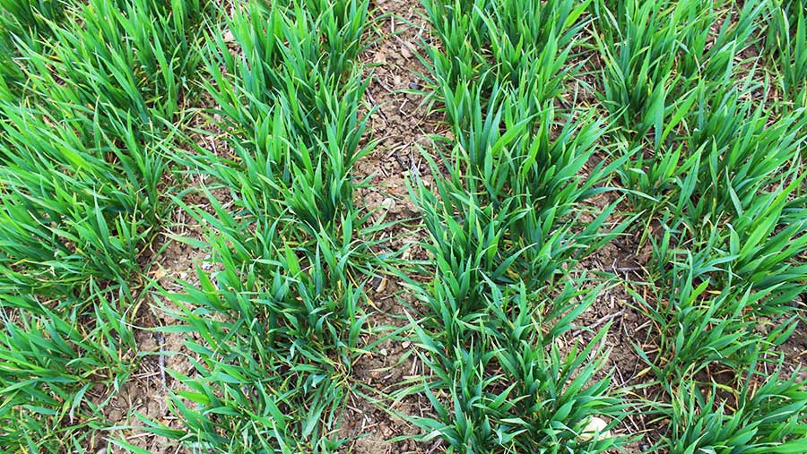 Crusoe milling wheat drilled with the Mzuri leaves a wider gap between rows compared with other drills © Oli Hill