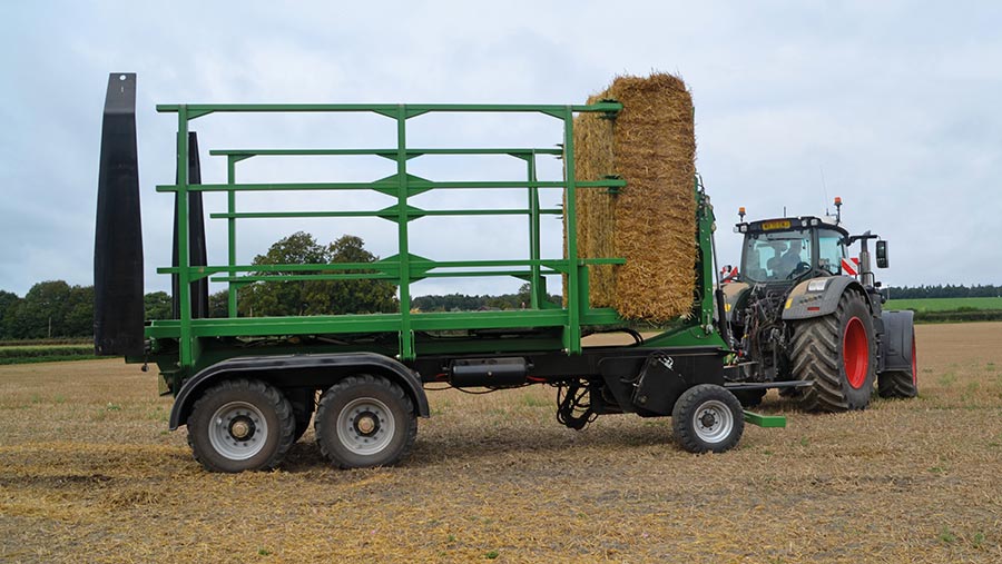 Prior to this he used a squeeze trailer – also built in the farm workshop – that allowed stacks of 14 bales to be picked up and moved in one.