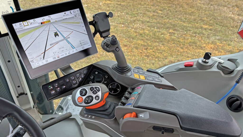 Across from this is a high-tech secondary joystick, littered with switches that allow it to perform up to 30 programmable functions – either on the tractor or an isobus-controlled implement.