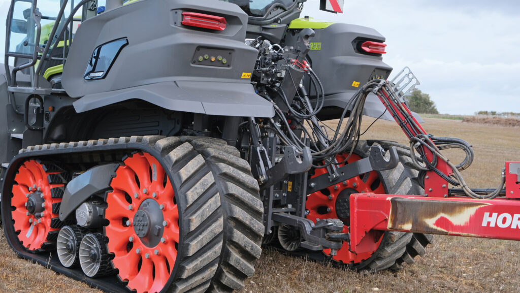 Tough, puncture-resistance tracks are also on the menu, as are heavy-duty aluminium drive pads. These are only required for clamp work, when pushing wet maize and wholecrop.