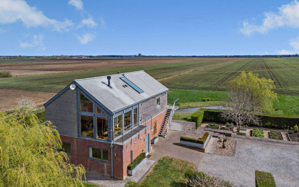 The reversed living layout places the open plan kitchen and living area on the first floor with exposed timber beams, maximising views across Lincolnshire. Solar shading supports the ground floor bedrooms and the house sits on piled foundations with a raised ground floor. Large glazed areas bring in generous natural light, and the sitting room enjoys views of both solstices and Lincoln Cathedral. Two balconies lead from the kitchen diner and living area.