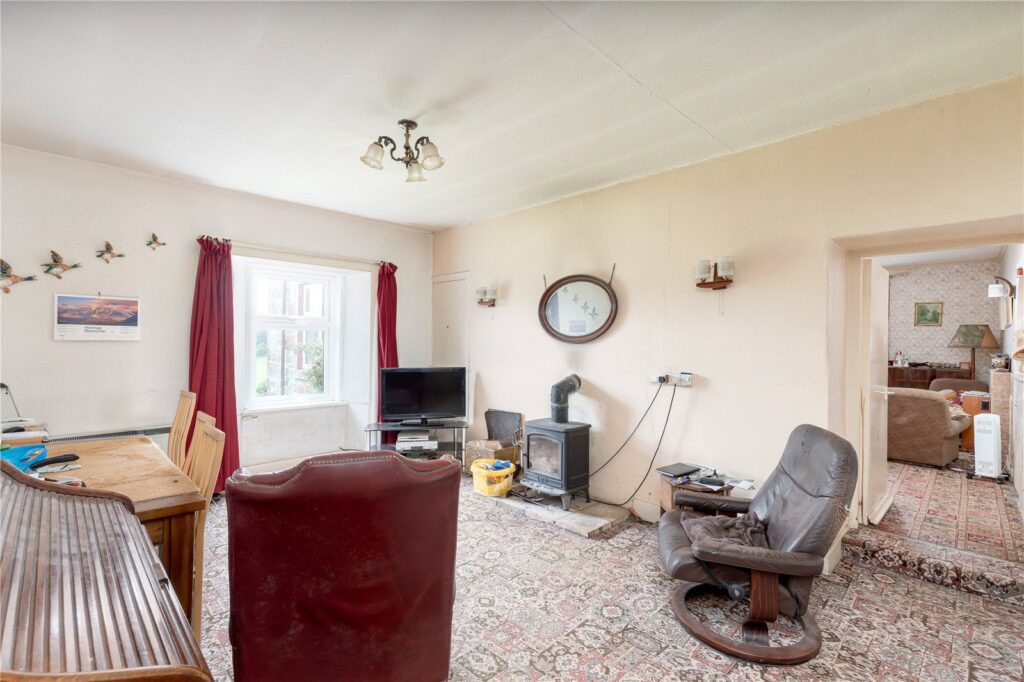 The front door leads into a hallway, off which are two bedrooms and a sitting room (with fireplace) as well as stairs to the first floor. Beyond this sitting room is a family room with wood burning stove which leads into a hallway providing access to the family bathroom (bath, shower, WC and washbasin) and kitchen, which has a basic range of units and an oil fired Rayburn. The kitchen also benefits from a pantry, stores and a boot room which leads to the external courtyard area under the archway.