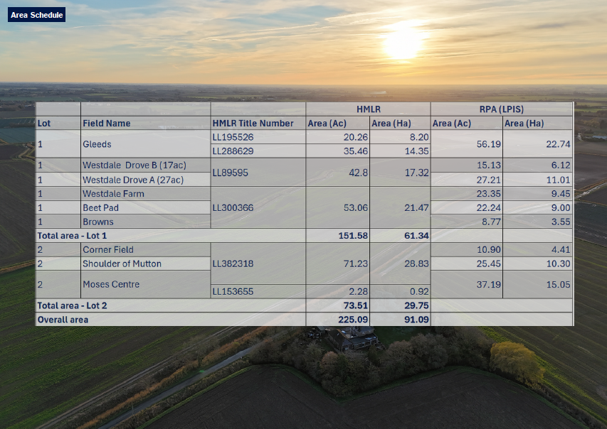 Lot 1 – What3Words – ///lawns.enjoyable.cactus Lot 2 – What3Words – ///treatment.cost.combines Plans Areas and Schedules The property comprises multiple Land Registry titles. The areas referred to in these particulars are derived from the measured areas of the constituent title parts as downloaded into the Land App and the unregistered areas based on the deeds transferred onto and measured in the Land App. These are shown in the column labelled HMLR Title areas in the land schedule for each field. The LPIS areas on the land schedule are based on RPA data. They are provided for illustrative purposes only.
