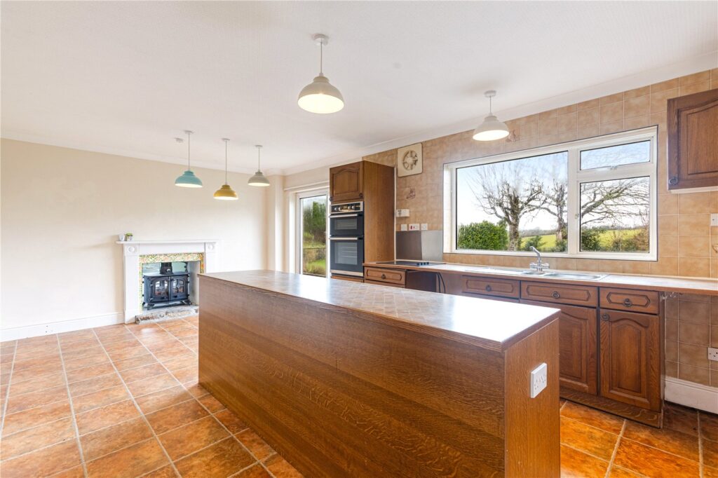 The accommodation includes a welcoming entrance hall with built-in cupboards and timber staircase, a generous kitchen/breakfast room with fitted timber units, centre island and patio doors to the rear, and a dual-facing wood-burning stove shared with the living room. The lounge/dining room is triple aspect with a stone fireplace and wood-burning stove. A utility room with cloakroom/WC, shower room and patio doors leads to a back hallway with external access.