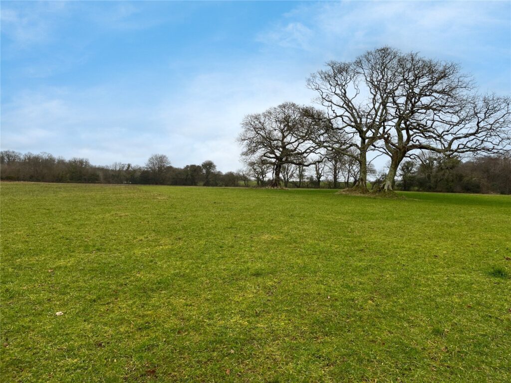 The pasture field to the north features a number of infield trees in addition to the mature woodland belt which divides the land and through which flows the water course, Forder Brook.