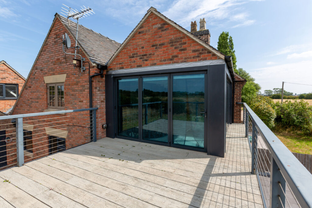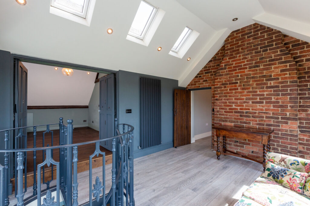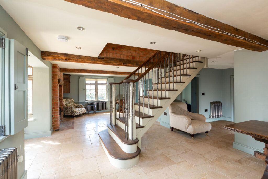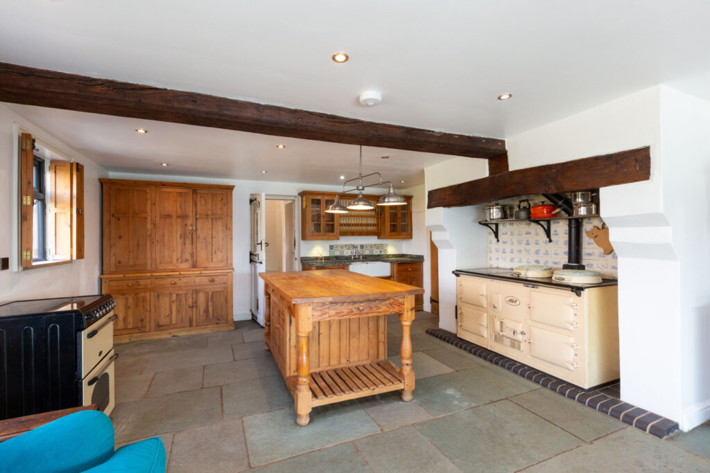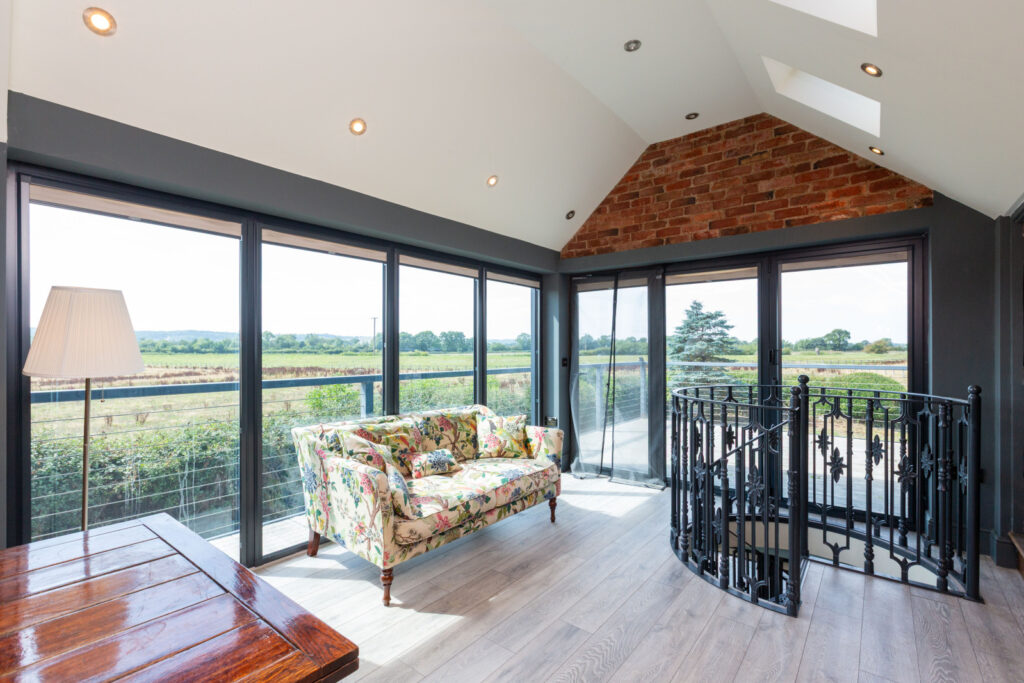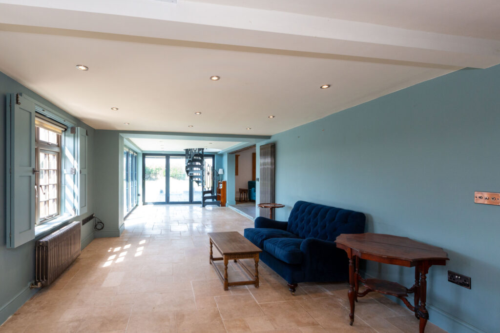 The most recent addition to the farmhouse is a striking kitchen and first-floor extension, designed with glass and steel to create a light, modern contrast to the traditional structure.